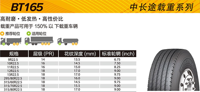 黑獅BT165是一款高端、主銷(xiāo)的適用于中長(zhǎng)途載重導(dǎo)拖輪使用的輪胎,具有高耐磨、低生熱、高性?xún)r(jià)比的特點(diǎn)。