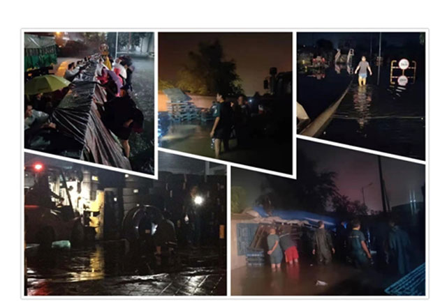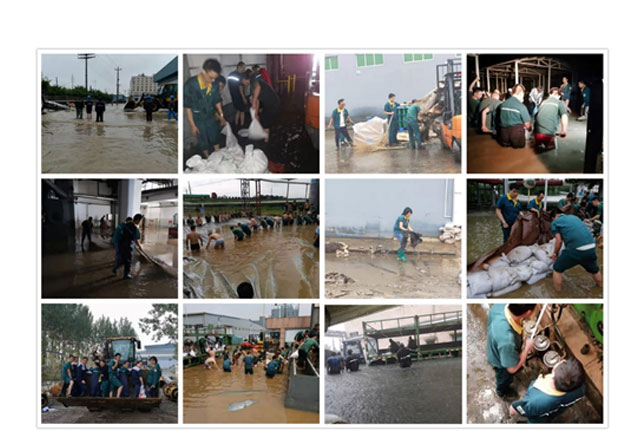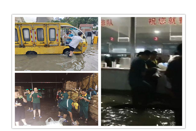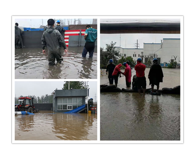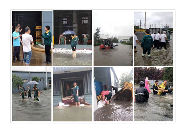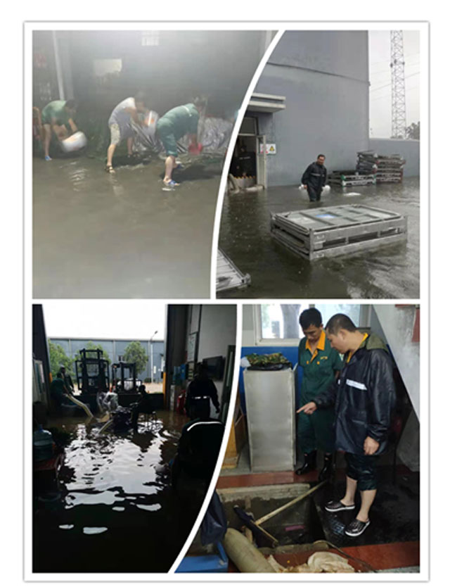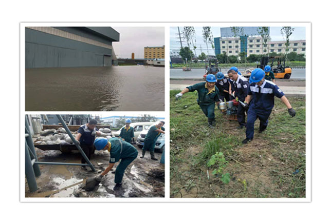 大雨侵襲中,地勢最低的東廠總變、原材料倉儲受災尤為嚴重,公司領(lǐng)導在了解現(xiàn)場情況后作出重要指示:一要堅持以人為本,在抗洪救災過程中把安全放在第一位;二要加強值班和溝通工作,合理安排人員密切關(guān)注災情變化,發(fā)現(xiàn)特殊情況及時上報,發(fā)現(xiàn)問題及時反饋。經(jīng)過全體領(lǐng)導、員工的齊心奮戰(zhàn),各個區(qū)域的災情基本得到控制。