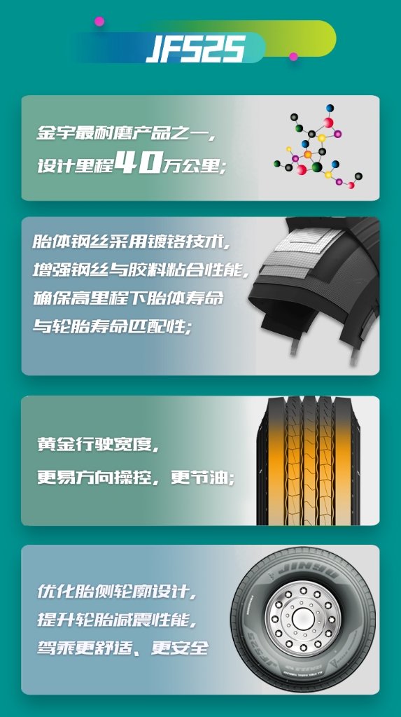 憑借著良好的技術儲備及優(yōu)異的現(xiàn)場管理能力,金宇無內(nèi)胎產(chǎn)品在耐磨性、質(zhì)量穩(wěn)定性、動均性均有不俗表現(xiàn),取得了渠道商、最終用戶的一致認可,566、578、595、596、573群星璀璨,而JF525憑借優(yōu)異的產(chǎn)品表現(xiàn),當之無愧成為金宇產(chǎn)品體系“星中之星”。